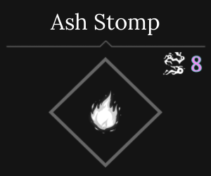 Stomp the ground aggressively, igniting the ground beneath you and releasing a magnitude of ash, dealing 4 Fire damage and leaving the ground scorched for 5 seconds. While enemies are within the radius of the stomp, apply a Burn Stack every second. Applies Slow.