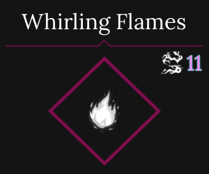 Twirl with heat, casting a fiery tornado that travels away from you, burning enemies in the way. Any affected enemy will be burnt for 3 Fire Damage and will be set on Fire.