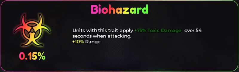 Units with this trait apply +75% Toxic Damage over 54 seconds and get a 10% range increase.
