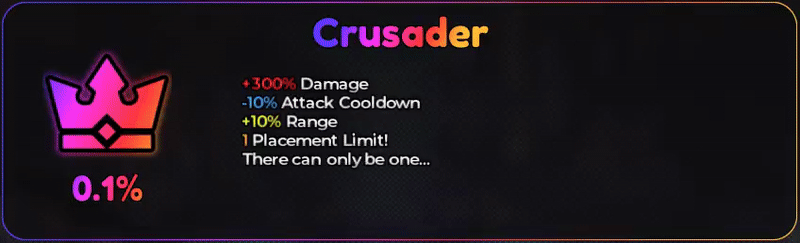 A Unit with this trait can only be placed once. It gets a 300% Damage and 10% Range increase while also getting 10% reduction in Attack Cooldown.