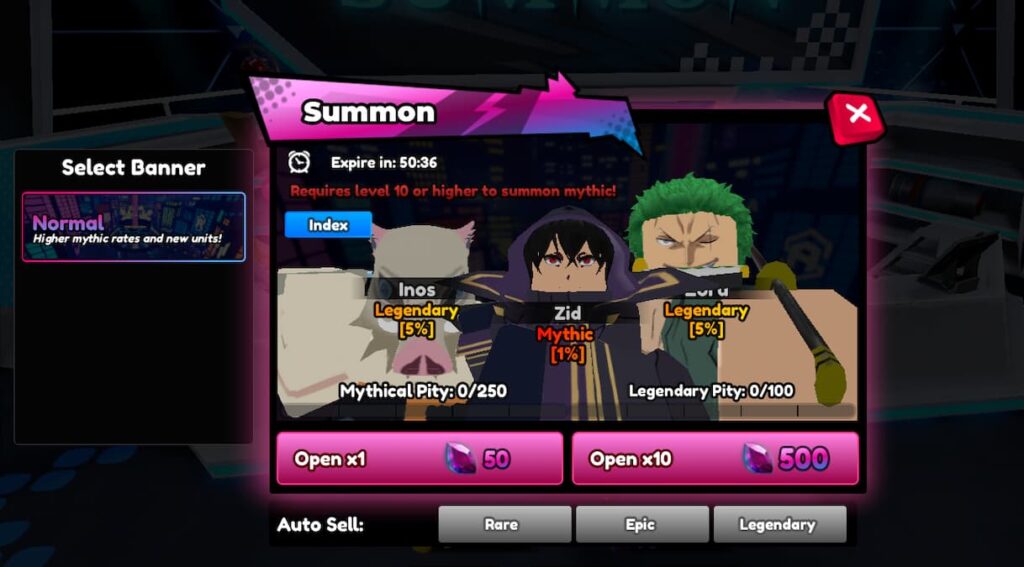 Each Summon chance costs 50 Gems. A Pity system for Mythical summons is also in the game, requiring a total of 250 Summons for a guaranteed Mythical Unit.