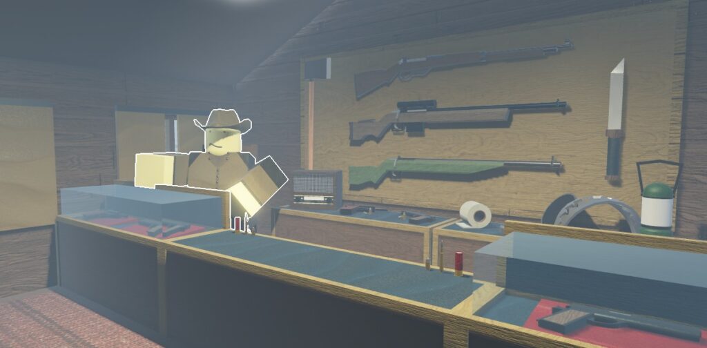 Once you first load in, you’ll be able to purchase Weapons by interacting with the John NPC inside of Zax’s Store (pictured above).