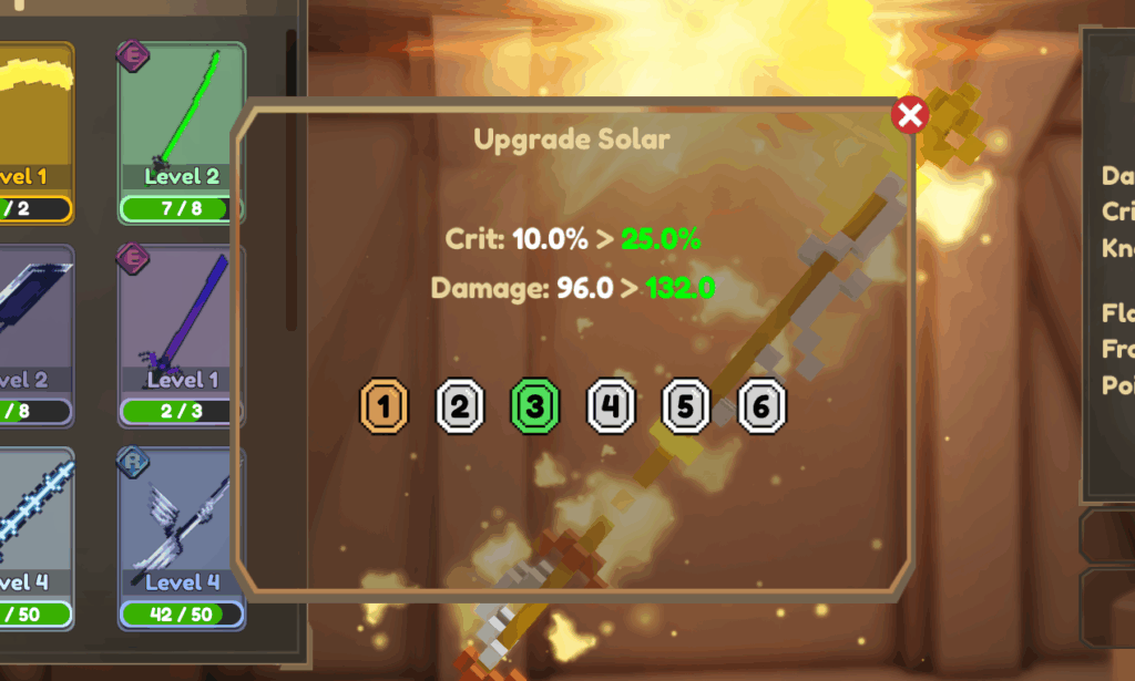 Solar is a Legendary Rarity Weapon in Pixel Blade. It’s one of the better Weapons, thanks to it’s high Damage Output and Crit Chance.
