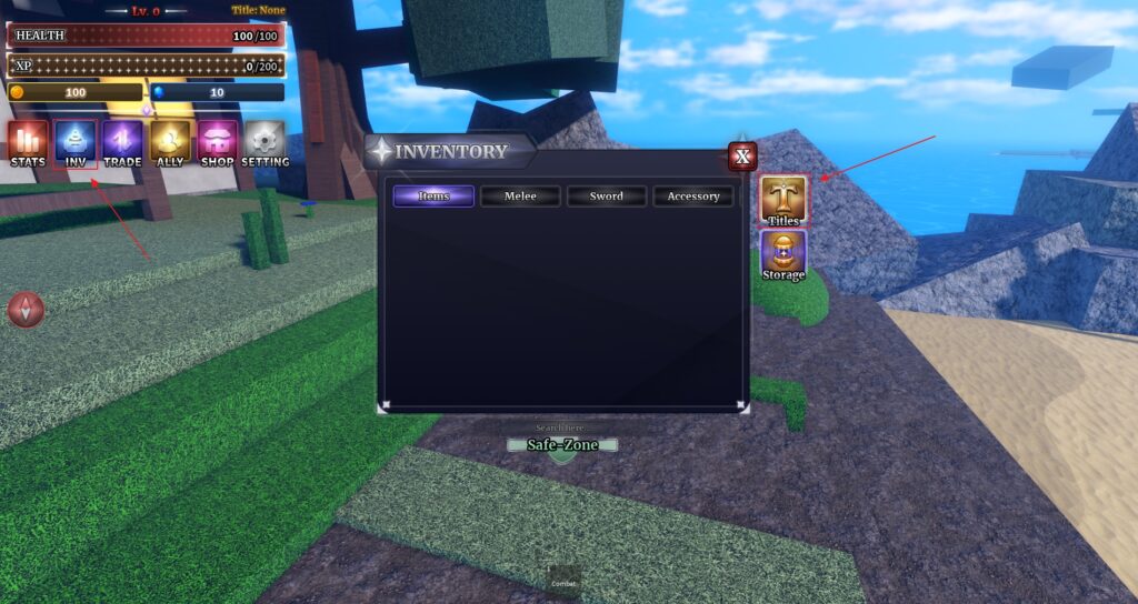 To equip Titles in Sailor Piece, you’ll first need to navigate to the “Titles” section. This can be done by opening up your Inventory (the blue INV icon below your Health Bar) and then clicking on the “Titles” icon on the left side.