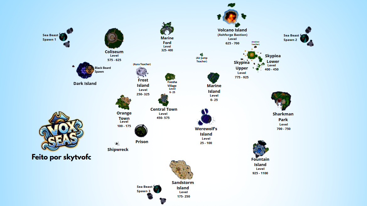 Here are the exact locations of every island and special island. You can travel between islands with a boat, for free, or an Iron Sail, for 500$.
