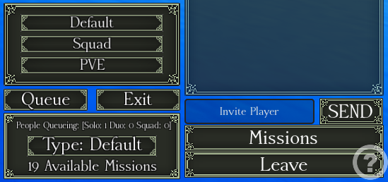 To start a mission, click on the missions button and choose one of the types (Default, Squad, PVE) and then press the Queue button.